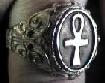 BA 1002 Prix : 245.00$ (grandeur de base . . . 10,5) Bague en argent, ornée d'un scarabée en argent et d'une croix de vie de chaque côté. |